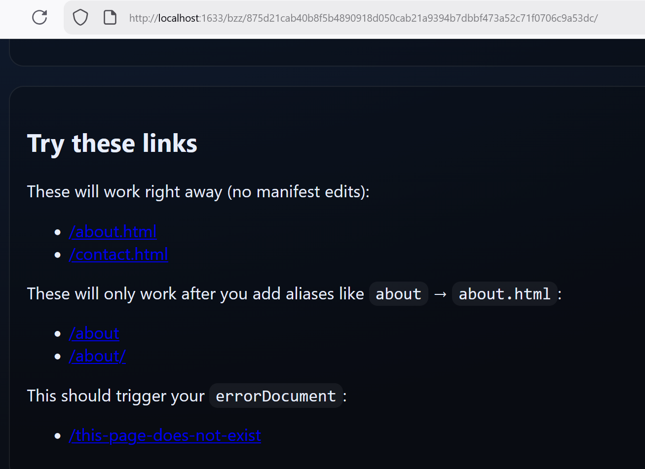 You will find that links to direct files with file extensions included like /about.html will work, but links to /about will not. This is because we have not yet modified our manifest to set up typical routing behavior.